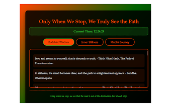Only When We Stop은 사용자가 불교의 지혜, 내면의 고요함, 마음챙김 여정의 세 가지 독특한 범주로 정리된 100개의 인용구를 제공하여 마음챙김을 향상시키기 위해 설계된 Chrome 확장 프로그램입니다. 각 범주에는 성찰과 자기 발견을 장려하는 아름답게 제작된 인용구가 포함되어 있어, 마음챙김을 일상에 통합하고자 하는 모든 사람에게 귀중한 도구가 됩니다. 인터페이스는 사용자 친화적이며, 둥근 탭 버튼과 인용구를 쉽게 탐색할 수 있는 스크롤 가능한 영역이 있습니다.